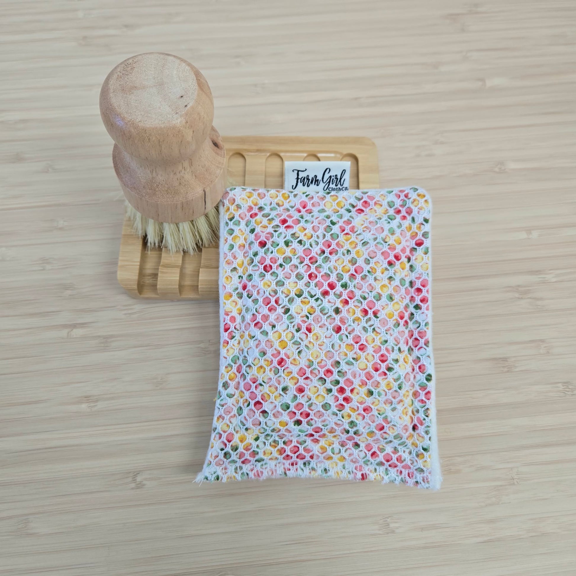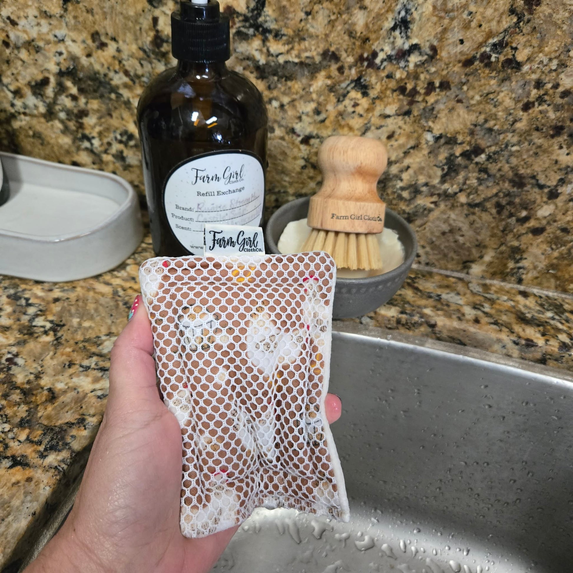Farm Girl Unsponges are handmade with high quality materials in cute patterns. Made from Organic Hemp/Cotton Fleece for high absorbency and soft washing surface (naturally antibacterial!), thin layer of eco recycled foam to absorb and make suds, flannel or cotton print for absorbency and color, and mesh topper for gentle scrub. Approximately 5.5" x 4" fits nicely in your hand, and fits in bowls and cups with ease. Be careful with knives and sharp objects that will cut the sponge!