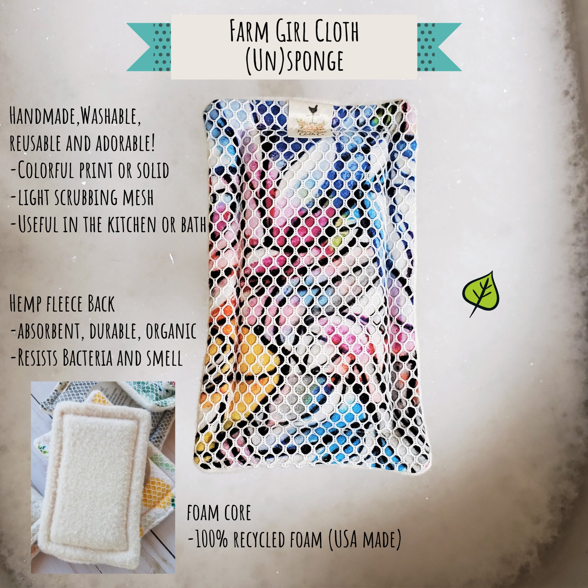 Farm Girl Unsponges are handmade with high quality materials in cute patterns. Made from Organic Hemp/Cotton Fleece for high absorbency and soft washing surface (naturally antibacterial!), thin layer of eco recycled foam to absorb and make suds, flannel or cotton print for absorbency and color, and mesh topper for gentle scrub. Approximately 5.5" x 4" fits nicely in your hand, and fits in bowls and cups with ease. Be careful with knives and sharp objects that will cut the sponge!